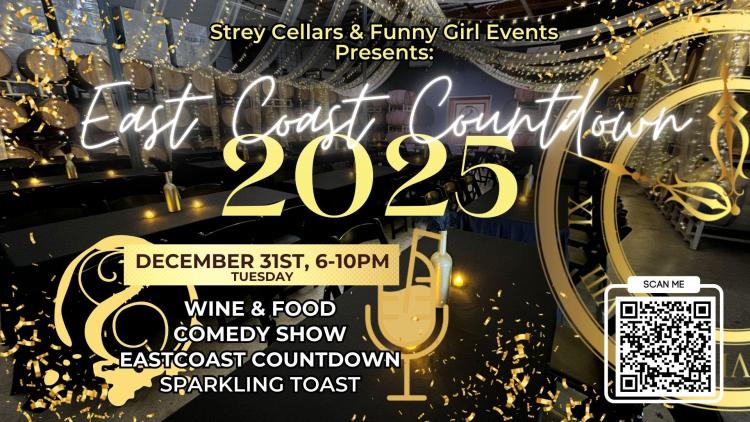 It's a party at Strey Cellars! Enjoy a wine and food comedy show & east coast countdown with a sparkling toast. Doors open at 6 pm and the comedy event starts at 7 pm with comedians from HBO, Conan, & Comedy Central!