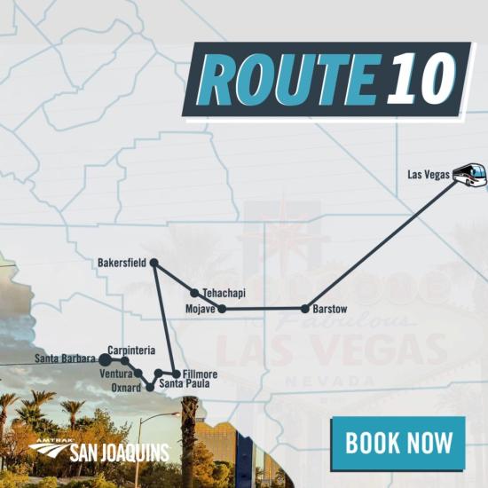Amtrak San Joaquins’ Route 10 is your connection to adventure—with stops in Las Vegas, Barstow, Mojave, Tehachapi, Bakersfield, Fillmore, Santa Paula, Oxnard, Ventura, Carpinteria and Santa Barbara.