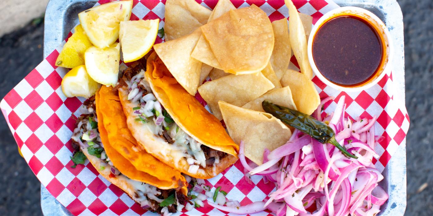 Sample menu items from Oxnard's epic taco scene, including quesatacos, barbacoa plates, los vampiros, birria machetes, red mulitas, torta titanics, birria pizzadillas and more!